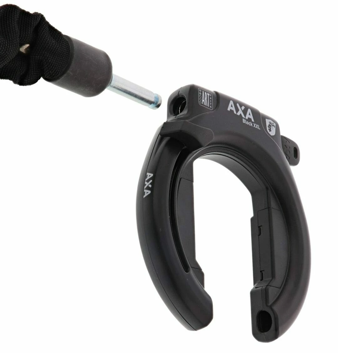 AXA Block XXL är ett högkvalitativt ramlås som även har anslutningsmöjligheten att länka ULC plug-in-kedja eller UPI plug-in-kabel. Detta för att kunna låsa fast din cykel i ett fast föremål.