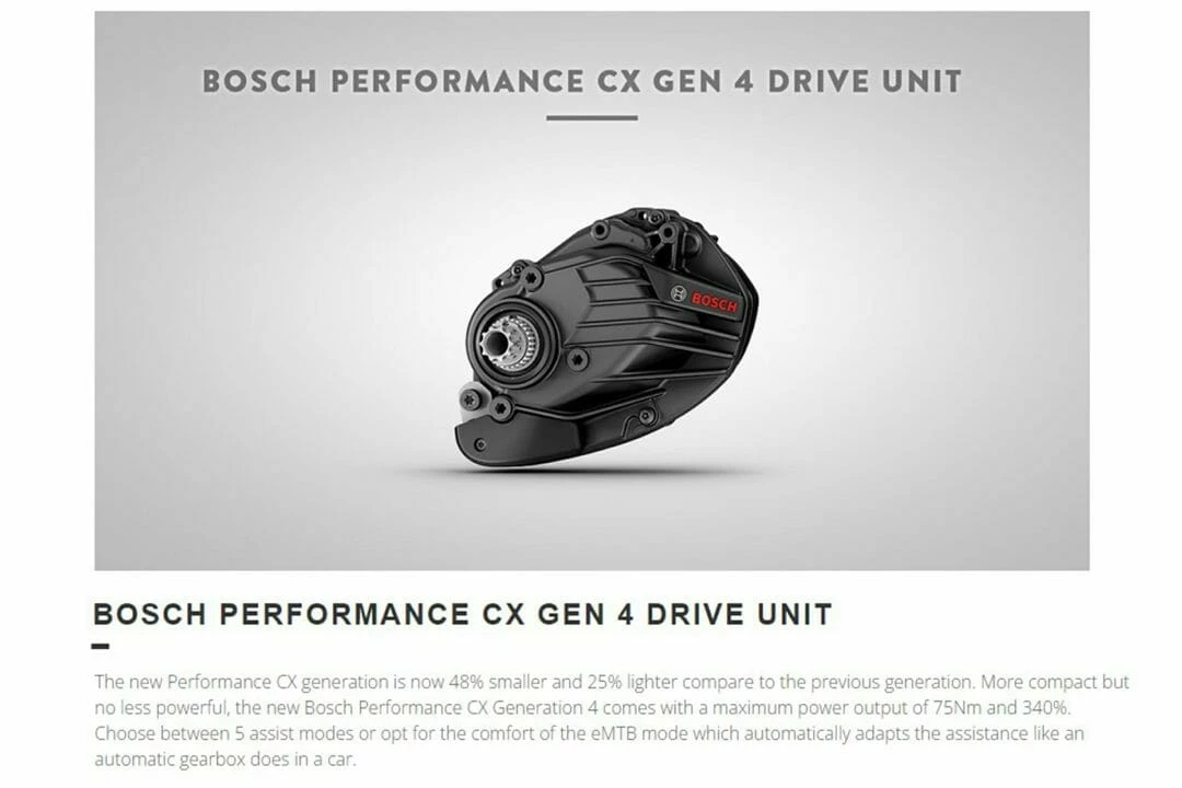- Supermotorn Bosch Performance CX (generation 4) är bättre än någonsin, mindre, lättare och effektivare. Cyklingen känns ännu mer naturlig, både när du trampar och rullar. På maxläget har du hela 85Nm kraft, vilket gör att du kan ta dig an alla uppförsbackar med ett leende.