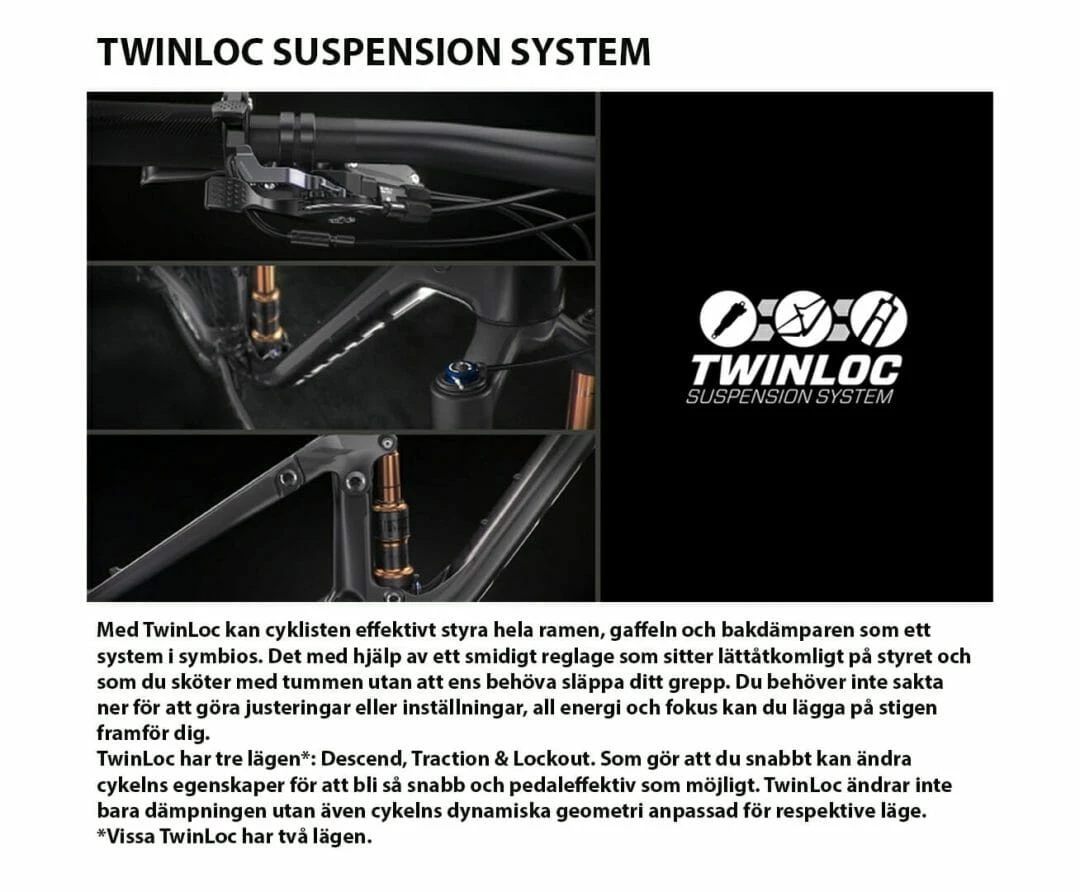 - Med hjälp av TwinLoc 2-reglaget på styret kan du ställa slaglängden på dämpningen i tre lägen; Lockout-Traction-Descend (0mm-90mm-140mm). Fram- och bakdämparen ställs i symbios med varandra. Gör det mycket enkelt för dig att snabbt ändra cykelns egenskaper efter rådande underlag och lutning.
