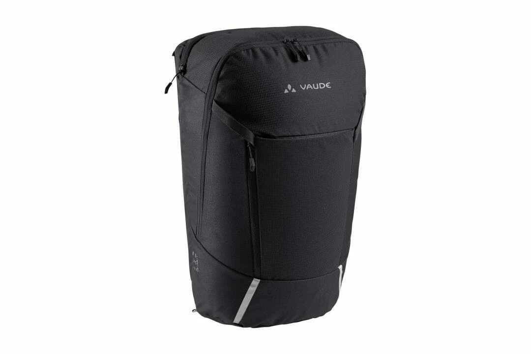 Ryggsäck eller cykelväska? Cycle 20 är både och! Blir den idealiska följeslagaren för cykelpendlare som vill ha en säker väska under resan, men som också vill bära väskan som ryggsäck på tåget, bussen eller på jobbet. Väskan fästs på din pakethållare med låsbara QMR-krokar och den går vid behov att enkelt göra om till en ryggsäck. Öppna bara de två vertikala dragkedjorna och hela systemet kan stuvas undan i ett fack med kardborrestängning. En insydd, lätt avtagbar etikett förklarar hur man konverterar väskan med bara några få steg. Men denna smarta kombination av ryggsäck och cykelväska erbjuder ännu mer. I det stora huvudfacket finns plats för A4-dokument, en mesh-organizer med dragkedja för småsaker som hjälper till att hålla ordning och reda. Ett separat vadderat fack med dragkedja rymmer bärbar dator upp till 15,6″. Det finns en platt nätficka för snabb förvaring på framsidan. En hjälmhållare och reflekterande element snyggt integrerade i designen avrundar väskans praktiska funktioner. VAUDE Green Shape-etiketten står för miljövänliga, funktionella produkter tillverkade av hållbara, delvis återvunna material.
