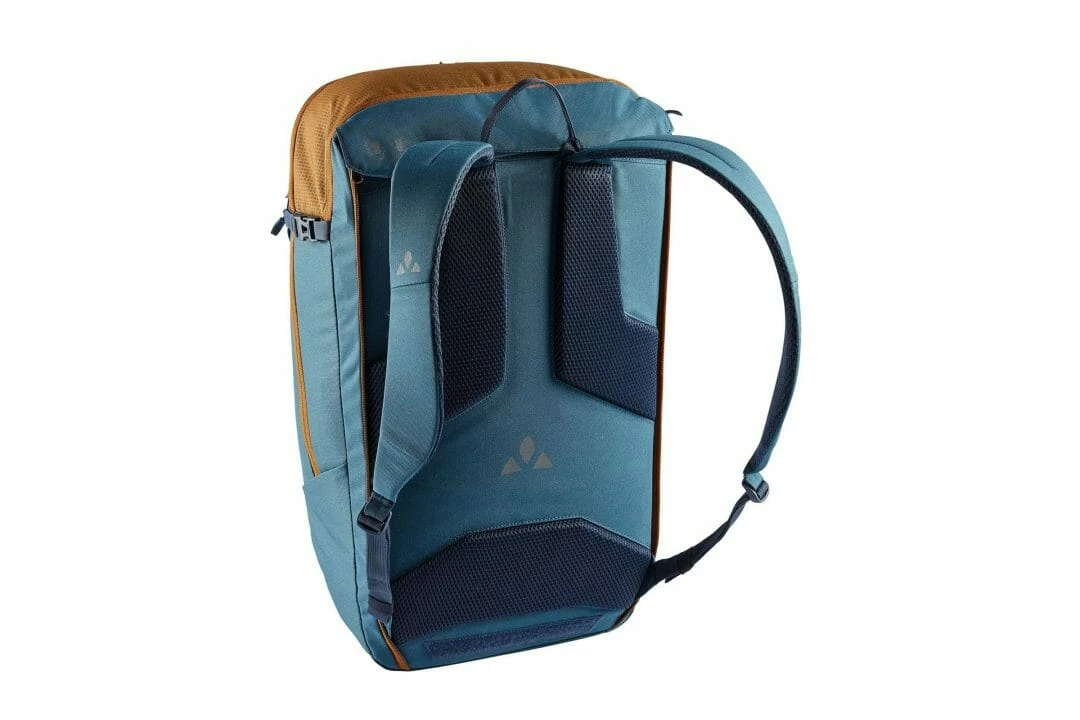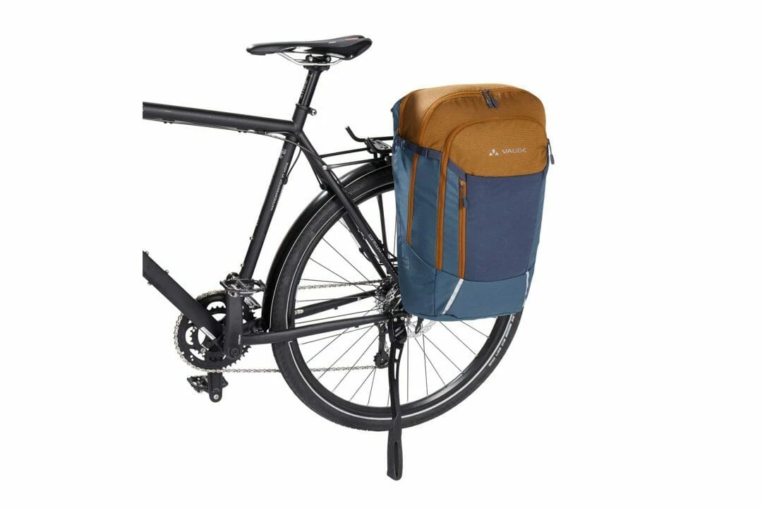 Ryggsäck eller cykelväska? Cycle 28 är både och! Blir den idealiska följeslagaren för cykelpendlare som vill ha en säker väska under resan, men som också vill bära väskan som ryggsäck på tåget, bussen eller på jobbet. Väskan fästs på din pakethållare med låsbara QMR-krokar och den går vid behov att enkelt göra om till en ryggsäck. Öppna bara de två vertikala dragkedjorna och hela systemet kan stuvas undan i ett fack med kardborrestängning. En insydd, lätt avtagbar etikett förklarar hur man konverterar väskan med bara några få steg. Men denna smarta kombination av ryggsäck och cykelväska erbjuder ännu mer. I det stora huvudfacket finns plats för A4-dokument, en mesh-organizer med dragkedja för småsaker som hjälper till att hålla ordning och reda. Ett separat vadderat fack med dragkedja rymmer bärbar dator upp till 15,6″. Det finns en platt nätficka för snabb förvaring på framsidan. En hjälmhållare och reflekterande element snyggt integrerade i designen avrundar väskans praktiska funktioner. VAUDE Green Shape-etiketten står för miljövänliga, funktionella produkter tillverkade av hållbara, delvis återvunna material.